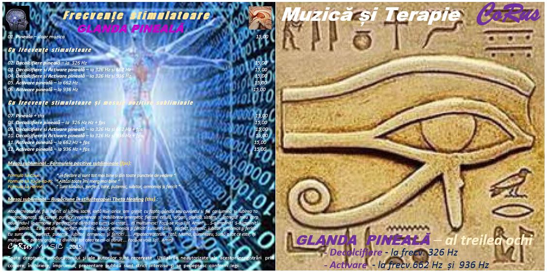 Muzică și terapie - Glanda pineală (07.03.2015)Acest album conține o singură piesă căreia i s-au adaugat pe rând în fundal frecvențe stimulatoare cu rol benefic de decalcifiere a glandei la frecvența de 326 Hz și de activare la frecvențele 662 Hz și 936 Hz, precum și mesaje tip fraze pozitive subliminale (fps) sau de tip terapie theta healing (ths) .. de aici rezultând multitudinea de combinații cu frecvențe, cu frecvențe și fps sau combinații cu ths. Acest album este dedicat tururor celor care vor și un altfel de mijloc de terapie neconvențională sau preventivă. Glanda PinealăGlanda pineală numită și “al treilea ochi” sau ochiul spiritual când este normală funcțional și trezită spiritual are efecte asupra expandării conștiinței pe când calcifierea și blocarea ei din varii motive, unele diete grește, florul din pasta de dinți, băuturile carbogazoase, câmpul nociv ectromagnetic al noii tehnologii, micounde, tv, computere, telefoane .. etc , sexul abuziv și muzica agresivă și distorsionată, cuvinte vulgare, etc .. stopează această expandare. Mai multe amănunte despre pineală, cum funcționează, factorii care o influentează, terapie .. etc .. pe blogul meu la articolul Muzică și terapie – Glanda pineală: http://www.luminapentrutoti.ro/muzica-si-terapie-glanda-pineala-decalcifiere-si-activare/. Frecvențele stimulatoare folositeÎn urma studiilor făcute în domeniul frecvențelor și influența lor asupra corpului uman, în ceea ce privește glanda pineala s-a constatat că frecvența 326 Hz stimulează decalcifierea pe când frecvențele 662 Hz și 936 Hz activează funcția glandei. Aceaste frecvențe stimulatoare sunt amplasate în spatele fondului muzical care este acordat pe cât posibil ca tonalitate cu frecvențele pentru a se armoniza cât mai bine cu ele și a nu crea dizonanță. Mai multe amănunte despre studiul frecvențelor, frecvențe fundamentale, frecvențele creației, frecvențe vindecătoare ale corpului, etc .. pe: http://www.luminapentrutoti.ro/muzica-terapeutica-frecvente-fundamentale-si-stimulator-vindecatoare/. Mesajele subliminale folosite - (fps) și (ths):Având în vedere că și cuvântul este vibrație și deci și el este vindecător și mesaje subliminale de vindecare prin cuvânt au un rol la fel de important ca și cele prin frecvențe stimulatoare. Mesajul subliminal (video sau audio):Este un semnal sau mesaj conceput să fie transmis sub limitele normale a percepției dar fiind perceput de subconsțient. Atunci când sugestiile sunt pozitive, rezultatele sunt uimitoare: relaxare și echilibrare, reducerea depresiei, atenuarea durerii, vindecare, dobândirea unei gândiri pozitive, încrederea în sine, eliberarea de dependențe sau limitări, realizarea de performanțe sportive ...etc. Cel mai bun moment pentru ascultarea subliminalului este seara, înainte de culcare, sau dimineața, imediat după trezire, atunci când visele noastre au toate șansele să fie orientate în sensul reprogramării pe care o dorim. Formulele pozitive subliminale (fps):Formula lui Coue: “ În fiecare zi sunt tot mai bine și din toate punctele de vedere “ Formula lui Tu-Se-Ka-Ri: “ Astăzi toate îmi merg mai bine “ Formula lui Hannel: “ Sunt sănătos, perfect, tare, puternic, iubitor, armonios și fericit “ Rugăciune în stilul terapiei Theta Healing (ths):Atoatecreatorule, flux infinit al iubirii sacre, iartă mie orice am greșit cu fapta, gândul sau cuvântul și fie ca lumina și iubirea Ta necondiționată, să curețe, purifice, regenereze și echilibreze energetic fiecare celulă, organ , glandă, sistem, ... întregul meu corp aducându-l la armonie și perfecțiune divină așa cum L-ai creat. Iți multumesc! Facă-se voia Ta! Amin! S-a împlinit! S-a împlinit! S-a împlinit! Eu sunt divin, perfect, puternic, iubitor, armonios şi fericit! Eu sunt divin, perfect, puternic, iubitor, armonios şi fericit! Eu sunt divin, perfect, puternic, iubitor, armonios şi fericit!. Atoatecreatorule, Tată, Mama, Dumnezeu, Sursă a tot ce este, iți mulțumesc pentru grația Ta divină și tot ceea ce mi-ai dăruit. Facă-se voia Ta!. Amin! Download (12 piese, format mp3)