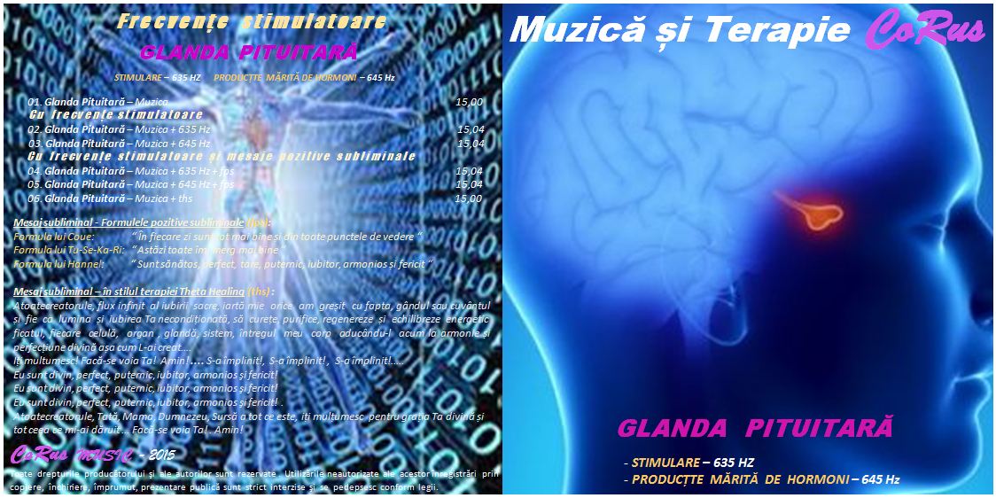 Muzică și terapie - Glanda pituitară (30.07.2015)Acest album format din șase piese, conține de fapt o singură melodie căreia i s-au adaugat pe rând frecvențe stimulatoare cu rol de activare și echilibrare a funcției glandei pituitare precum și mesaje subliminale pozitive sau de tip terapie theta subliminal. Glanda Pituitară – HipofizaGlanda hipofiză (pituitară) este un mic organ endocrin situat într-o cavitate a osului sfenoid, aflată în înteriorul cutiei craniene. Glanda este legată de hipotalamus şi în ciuda dimensiunilor ei mici (are mărimea unui bob de mazăre, cântărind doar 0,5 g) joacă un rol esenţial în organismul uman, controlând secreţia celorlalte glande endocrine prin hormonii pe care îi produce. Dezechilibrele glandeiDezechilibrele glandei pot da simptome precum durerile de cap, tulburări de vedere, greață și vărsături, stare de oboseală, lipsă de energie, episoade de depresie ... etc Dezechilibrele glandei pot duce și la apariția unor tulburări mai grave în organism, cum ar fi apariția acromegaliei și gigantismului sau la acumularea de țesut adipos la nivelul fetei, spatelui și pieptului alături de subțierea mainilor și picioarelor, dar și alte afecțiuni mergând de la creșterea nivelului glucozei în sânge, slăbiciune musculară și osoasă, îmbujorarea feței și creșterea tensiunii arteriale până la dezechilibre în secreția lactică și oprirea ciclurilor menstruale la femei și impotență la bărbați. Frecvențele stimulatoare folositeÎn urma studiilor făcute în domeniul frecvențelor și influența lor asupra corpului uman, în ceea ce privește glanda pituitară s-a constatat că frecvența 635 Hz stimulează și echilibrează funcția glandei iar frecvența de 645 Hz duce la o creștere suplimentară a producției de hormoni. Formulele pozitive subliminale (fps):