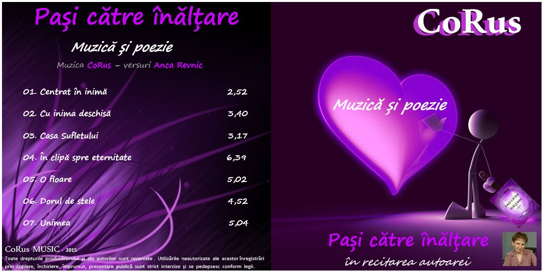 Muzică și poezie - Pași către înălțare (01.01.2015)Pași către înălțare este un album spiritual pe care îl dedic tuturor iubitorilor de muzică și poezie și în special celor ce vor sa facă "pași către înalțare" prin intermediul muzicii și poeziei pentru că fiecare poezie care stă la baza unui cântec este o esență spirituală, mergând de la centrarea în inimă, la deschiderea inimii, regăsirea iubirii în liniștea inimii, a prezenței în clipă văzând frumusețea în toate, a iubirii și a iubirii pentru Pământ pentru care ne-am întrupat să învățăm cântecul vieții, și nu în ultimul rând al visului Unimii când vom fi cu toți un gând uniți în inimă și cânt și în această idee, că o inimă suntem cu toții, închei prezentarea albumului cu câteva versuri ale poetei Anca Revnic, ca dedicație pentru dăruirea volumulului „Pași către înălțare”, și anume: Eu Sunt tu .... Download (7 piese, format mp3)