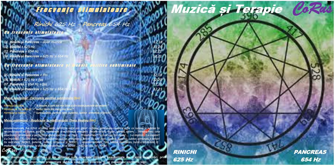 Muzică și terapie - Rinichi și pancreas (07.03.2015)Acest album conține o singură piesă căreia i s-au adaugat pe rând în fundal frecvențe stimulatoare cu rol benefic de activare și echilibrare: a funcțiilor rinichiului la 625 Hz și a funcției pancreasului la 654 Hz, precum și mesaje tip fraze pozitive subliminale (fps) sau de tip terapie theta healing (ths) .. de aici rezultând multitudinea de combinații cu frecvențe, cu frecvențe și fps sau combinații cu ths. Acest prim album este dedicat în primul rând sorei mele Maria afectată de diabet ajuns deci în faza insulino dependent cu afectarea funcției renale, pancreasul nemaisecretând suficientă insulină ... precum și tururor celor care vor și un altfel de mijloc de terapie neconvențională sau preventivă. Frecvențe fundamentale și stimulatoar vindecătoareCercetătorii care au studiat aceste frecvențe fundamentale au descoperit că ele pot fi folosite pentru vindecare sufletească și trupească, deoarece au darul să reducă unele probleme emoționale și să readucă structurile corpului fizic la armonia arhetipală, prin refacerea ADN-ului. Pe lângă aceste frecvențe de bază numite și ale creației, cercetătorii au mai descoperit și unele frecvențe particulare care pot activa și echilibra funcțiile unor organe ale corpului, asta în caz că sunt afectate în urma unui dezechilibru energetic ducând astfel la vindecarea lor. Mai multe amănunte despre studiul frecvențelor, frecvențe fundamentale, frecvențele creației, frecvențe vindecătoare ale corpului, etc .. pe http://www.luminapentrutoti.ro/muzica-terapeutica-frecvente-fundamentale-si-stimulator-vindecatoare/. Rinichii și pancreasulRinichiul - este un organ complex ce are ca rol principal depurarea sângelui de substanțe toxice. Este un organ complex și nu e cazul să intrăm în detalii, funcția lui fiind influențată de mulți hormoni. Când acest organ nu funcționează corect face ca viața corpului să fie pusă în pericol prin intoxicarea sângelui, celulelor, organelor .. etc. ajungandu-se chiar la dializă. Pancreasul - îndeplinește mai multe funcții esențiale pentru sănătatea umană, cum ar fi producerea de insulină și secreția de enzime digestive esențiale pentru metabolismul propriu-zis. Când acesta nu funcționează corect produce pe lângă dezechilibre în metabolismul organismului și instalarea diabetului prin scăderea secreției de insulină. Frecvențele stimulatoare folositeÎn urma studiilor făcute în domeniul frecvențelor și influența lor asupra corpului uman, în ceea ce privește rinichiul și pancreasul s-a constatat că un rol benefic în stimularea și funcționarea acestor organe îl au frecvențele 625 Hz pentru rinichi și 654 Hz pentru pancreas. Deci, aceaste frecvențe stimulatoare amplasate în spatele fondului muzical care este acordat pe cât posibil ca tonalitate cu frecvențele pentru a se armoniza cât mai bine, sunt foarte bune pentru cei care au probleme cu funcția rinichilor sau a pancreasului prin așa zisul diabet unde pancreasul nu mai secretă insulină suficientă sau deloc în cazul celor insulino-dependenți și cărora în timp acest dezechilibru le deteriorează și funcția rinichilor, unii ajungând chiar la dializă. Mesajele subliminale folosite - (fps) și (ths):Având în vedere că și cuvântul este vibrație și deci și el este vindecător și mesaje subliminale de vindecare prin cuvânt au un rol la fel de important ca și cele prin frecvențe stimulatoare. Mesajul subliminal (video sau audio):Este un semnal sau mesaj conceput să fie transmis sub limitele normale a percepției dar fiind perceput de subconsțient. Atunci când sugestiile sunt pozitive, rezultatele sunt uimitoare: relaxare și echilibrare, reducerea depresiei, atenuarea durerii, vindecare, dobândirea unei gândiri pozitive, încrederea în sine, eliberarea de dependențe sau limitări, realizarea de performanțe sportive ...etc. Cel mai bun moment pentru ascultarea subliminalului este seara, înainte de culcare, sau dimineața, imediat după trezire, atunci când visele noastre au toate șansele să fie orientate în sensul reprogramării pe care o dorim. Formulele pozitive subliminale (fps):Formula lui Coue: “ În fiecare zi sunt tot mai bine și din toate punctele de vedere “ Formula lui Tu-Se-Ka-Ri: “ Astăzi toate îmi merg mai bine “ Formula lui Hannel: “ Sunt sănătos, perfect, tare, puternic, iubitor, armonios și fericit “ Rugăciune în stilul terapiei Theta Healing (ths):Atoatecreatorule, flux infinit al iubirii sacre, iartă mie orice am greșit cu fapta, gândul sau cuvântul și fie ca lumina și iubirea Ta necondiționată, să curețe, purifice, regenereze și echilibreze energetic fiecare celulă, organ , glandă, sistem, ... întregul meu corp aducându-l la armonie și perfecțiune divină așa cum L-ai creat. Iți multumesc! Facă-se voia Ta! Amin! S-a împlinit! S-a împlinit! S-a împlinit! Eu sunt divin, perfect, puternic, iubitor, armonios şi fericit! Eu sunt divin, perfect, puternic, iubitor, armonios şi fericit! Eu sunt divin, perfect, puternic, iubitor, armonios şi fericit!. Atoatecreatorule, Tată, Mama, Dumnezeu, Sursă a tot ce este, iți mulțumesc pentru grația Ta divină și tot ceea ce mi-ai dăruit. Facă-se voia Ta!. Amin! Download (8 piese, format mp3)