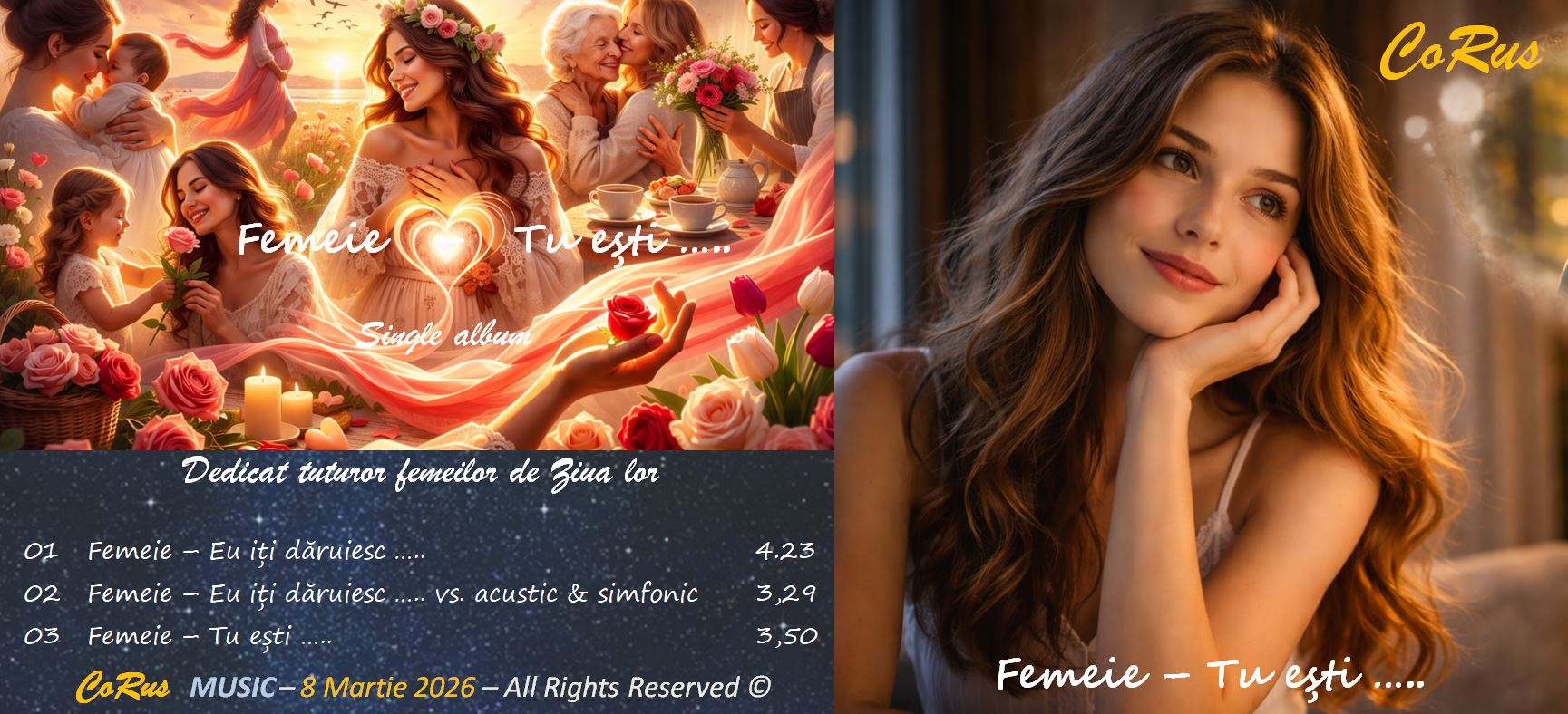 Femeie – Tu ești ... (08.03.2026)„Femeie – Tu ești ...” este un omagiu adus Femeii și este dedicat tuturor femeilor cu ocazia zilei de 8 Martie. Download (3 piese, format mp3)